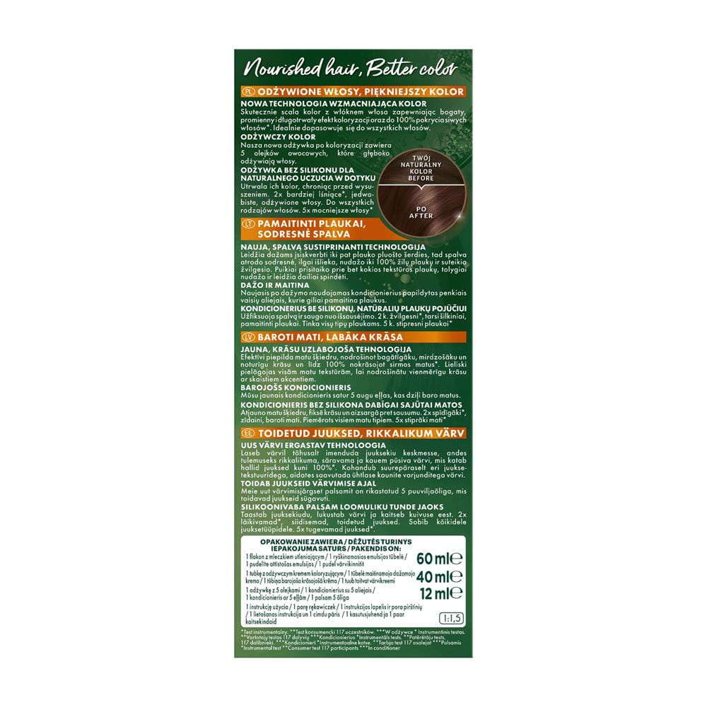 Łatwy sposób na ulubiony kolor 1. Wlej mleczko utleniające i krem koloryzujący do niemetalowej miseczki i dokładnie wymieszaj. 2. Nałóż całość mieszanki za pomocą pędzelka. Przestrzegaj dokładnie czasu aplikacji i następnie spłucz. 3. Aby zakończyć koloryzację, nałóż na całą długość włosów pielęgnującą odżywkę z 3 olejkami. Pozostaw na kilka minut i następnie spłucz. Twoje włosy są pełne blasku, elastyczne i miękkie w dotyku. Przestrzegać instrukcji użycia.