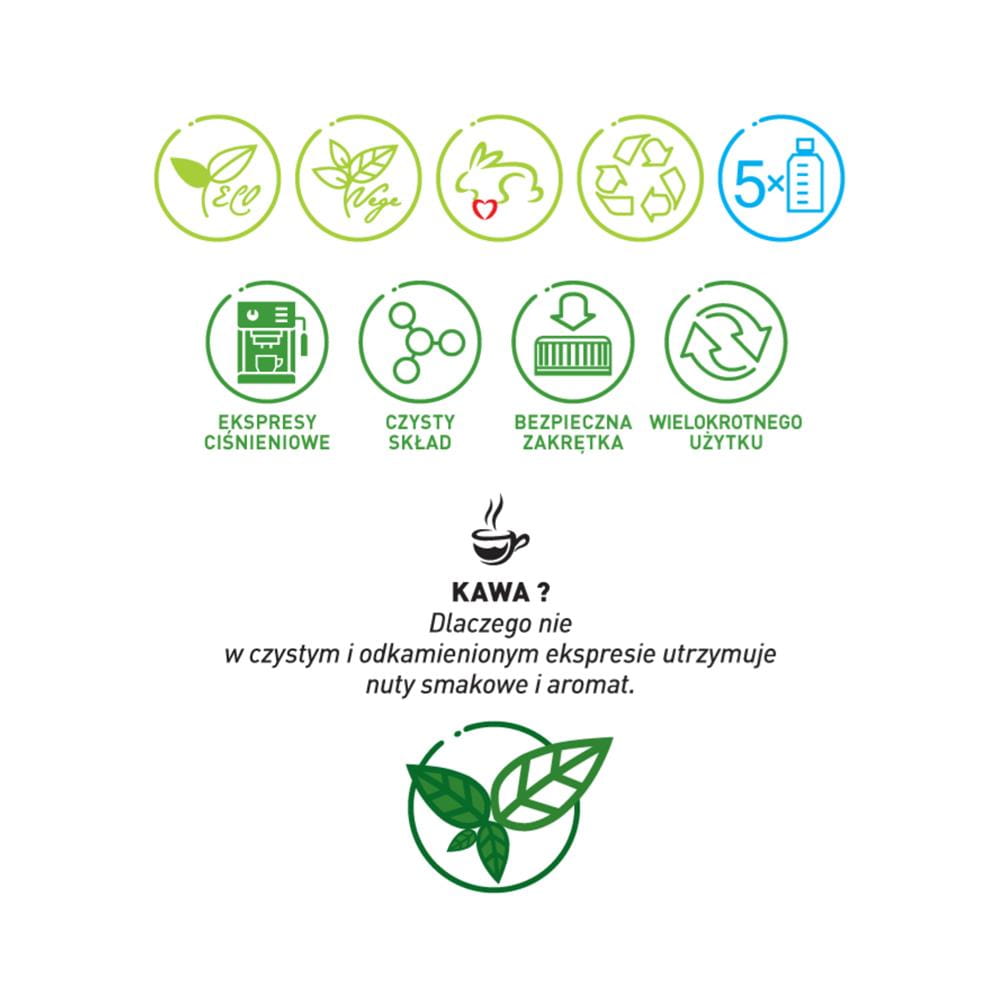 Jeśli instrukcja nie wskazuje inaczej: opróżnić pojemnik na wodę i wlać 100ml odkamieniacza do zbiornika danego modelu ekspresu i uzupełnić wodą (minimum 1 litr). Włączyć cykl usuwania kamienia i postępować zgodnie z instrukcjami pojawiającymi się na wyświetlaczu urządzenia lub umieszczonymi instrukcji dołączonej do ekspresu. Proporcje zastosowania odkamieniacza i wody uzależnione są od producenta i rodzaju ekspresu do kawy. W przypadku ekspresów z automatycznym odkamienianiem należy postępować zgodnie z instrukcjami wyświetlanymi na panelu. Po zakończeniu procesu odkamieniania należy kilkakrotnie przepłukać zbiornik czystą wodą. Regularne usuwanie kamienia w ekspresie przedłuża jego żywotność i zapewnia bezusterkowe działanie.