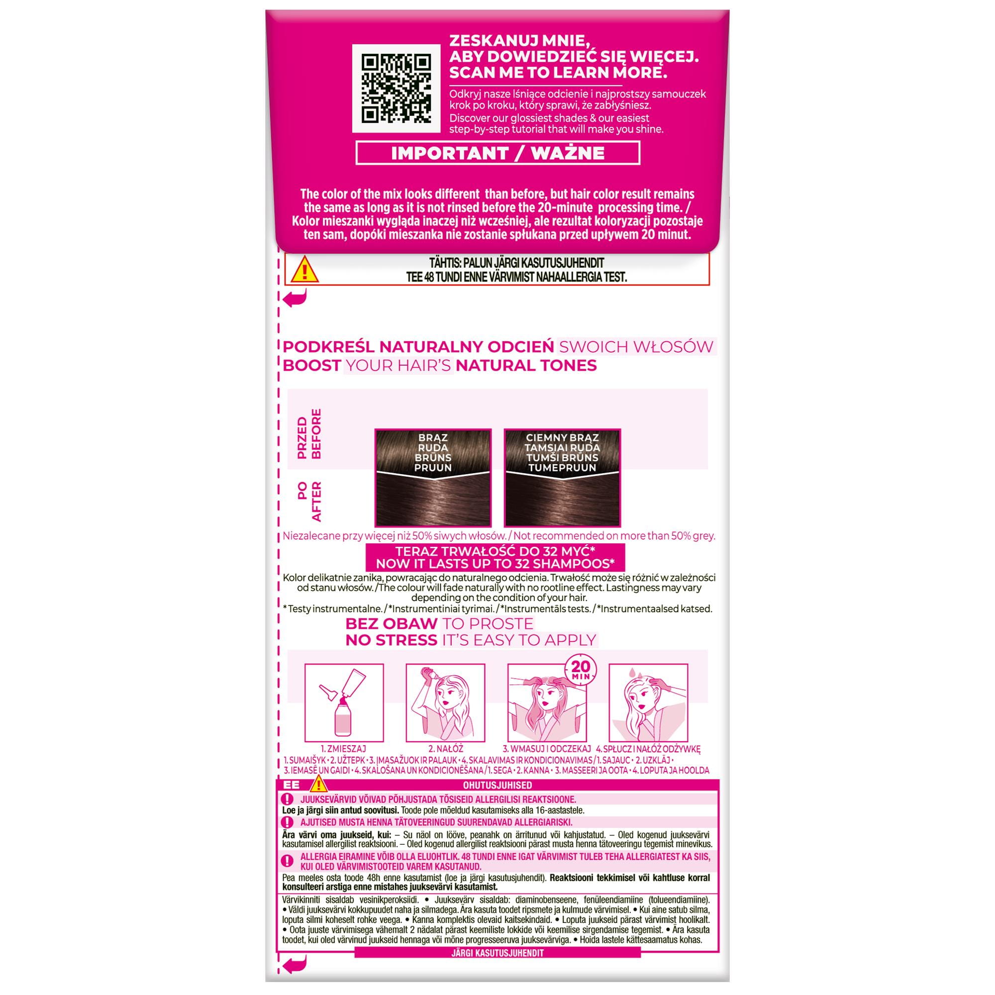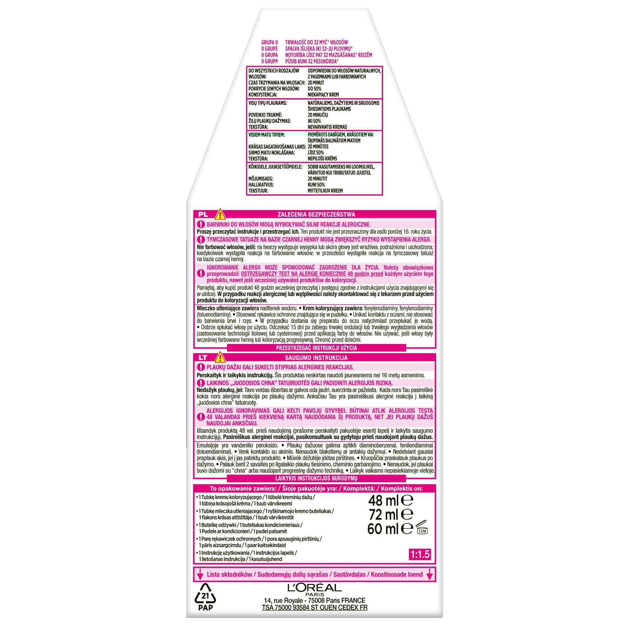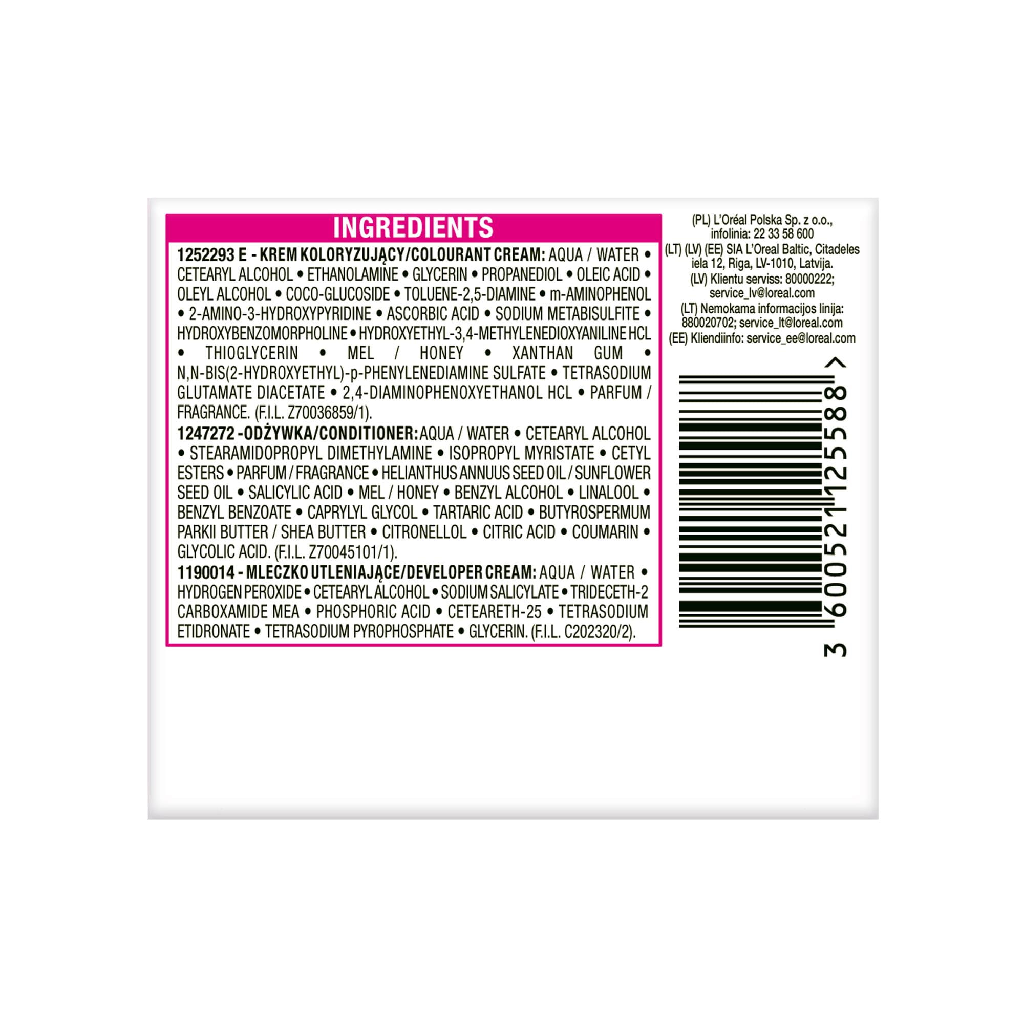 ZALECENIA BEZPIECZEŃSTWA BARWNIKI DO WŁOSÓW MOGĄ WYWOŁYWAĆ SILNE REAKCJE ALERGICZNE. Proszę przeczytać instrukcje i przestrzegać ich. Produkt nie jest przeznaczony dla osób poniżej 16 roku życia. TYMCZASOWE TATUAŻE NA BAZIE CZARNEJ HENNY MOGĄ ZWIĘKSZYĆ RYZYKO WYSTĄPIENIA ALERGII. Nie farbować włosów, jeśli: -na twarzy występuje wysypka lub skóra głowy jest wrażliwa, podrażniona i uszkodzona -kiedykolwiek wystąpiła reakcja na farbowanie włosów -w przeszłości wystąpiła reakcja na tymczasowy tatuaż na bazie czarnej henny. IGNOROWANIE ALERGII MOŻE SPOWODOWAĆ ZAGROŻENIE DLA ŻYCIA. Należy obowiązkowo przeprowadzić OSTRZEGAWCZY TEST NA ALERGIĘ KONIECZNIE 48 godzin przed każdym użyciem tego produktu, nawet jeśli wcześniej używałaś produktów do koloryzacji. Pamiętaj, aby kupić produkt 48 godzin wcześniej. (przeczytaj i postępuj zgodnie z instrukcjami użycia znajdującymi się w ulotce). W przypadku reakcji alergicznej lub wątpliwości należy skontaktować się z lekarzem przed użyciem produktu do koloryzacji włosów. Mleczko (krem) utleniające zawiera nadtlenek wodoru. Krem (żel) koloryzujący zawiera: fenylenodiaminy, fenylenodiaminy (toluenodiaminy), rezorcynę, amoniak. -Stosować rękawice ochronne znajdujące się w pudełku. -Unikać kontaktu z oczami, nie stosować do farbowania rzęs lub brwi. -W przypadku dostania się preparatu do oczu, natychmiast przepłukać je wodą. -Dobrze spłukać włosy po użyciu. Odczekać 15 dni po zabiegu trwałej ondulacji lub trwałego wygładzania włosów (zastosowanie technologii tiolowej lub cysteinowej) przed aplikacją farby do włosów. -Nie używać, jeśli włosy były wcześniej farbowane henną lub koloryzacją progresywną. -Chronić przed dziećmi. PRZESTRZEGAĆ INSTRUKCJI UŻYCIA Należy zapoznać się z listą składników znajdującą się poniżej.
