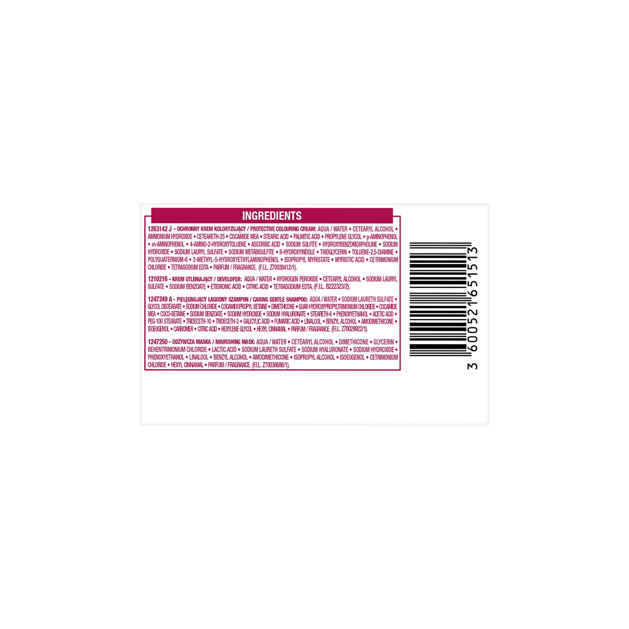ZALECENIA BEZPIECZEŃSTWA BARWNIKI DO WŁOSÓW MOGĄ WYWOŁYWAĆ SILNE REAKCJE ALERGICZNE. Proszę przeczytać instrukcje i przestrzegać ich. Produkt nie jest przeznaczony dla osób poniżej 16 roku życia. TYMCZASOWE TATUAŻE NA BAZIE CZARNEJ HENNY MOGĄ ZWIĘKSZYĆ RYZYKO WYSTĄPIENIA ALERGII. Nie farbować włosów, jeśli: -na twarzy występuje wysypka lub skóra głowy jest wrażliwa, podrażniona i uszkodzona -kiedykolwiek wystąpiła reakcja na farbowanie włosów -w przeszłości wystąpiła reakcja na tymczasowy tatuaż na bazie czarnej henny. IGNOROWANIE ALERGII MOŻE SPOWODOWAĆ ZAGROŻENIE DLA ŻYCIA. Należy obowiązkowo przeprowadzić OSTRZEGAWCZY TEST NA ALERGIĘ KONIECZNIE 48 godzin przed każdym użyciem tego produktu, nawet jeśli wcześniej używałaś produktów do koloryzacji. Pamiętaj, aby kupić produkt 48 godzin wcześniej. (przeczytaj i postępuj zgodnie z instrukcjami użycia znajdującymi się w ulotce). W przypadku reakcji alergicznej lub wątpliwości należy skontaktować się z lekarzem przed użyciem produktu do koloryzacji włosów. Mleczko (krem) utleniające zawiera nadtlenek wodoru. Krem (żel) koloryzujący zawiera: fenylenodiaminy, fenylenodiaminy (toluenodiaminy), rezorcynę, amoniak. -Stosować rękawice ochronne znajdujące się w pudełku. -Unikać kontaktu z oczami, nie stosować do farbowania rzęs lub brwi. -W przypadku dostania się preparatu do oczu, natychmiast przepłukać je wodą. -Dobrze spłukać włosy po użyciu. Odczekać 15 dni po zabiegu trwałej ondulacji lub trwałego wygładzania włosów (zastosowanie technologii tiolowej lub cysteinowej) przed aplikacją farby do włosów. -Nie używać, jeśli włosy były wcześniej farbowane henną lub koloryzacją progresywną. -Chronić przed dziećmi. PRZESTRZEGAĆ INSTRUKCJI UŻYCIA Należy zapoznać się z listą składników znajdującą się poniżej.