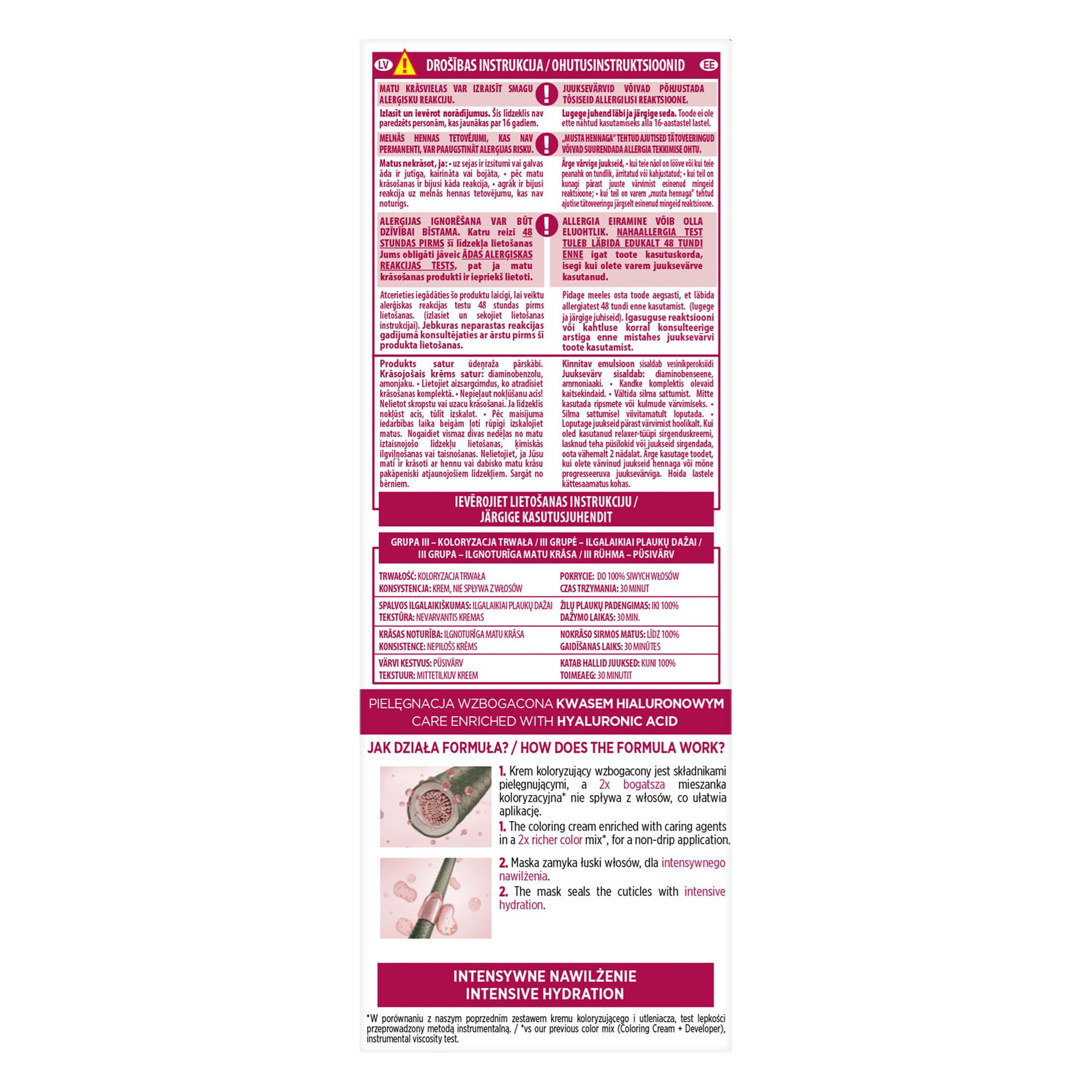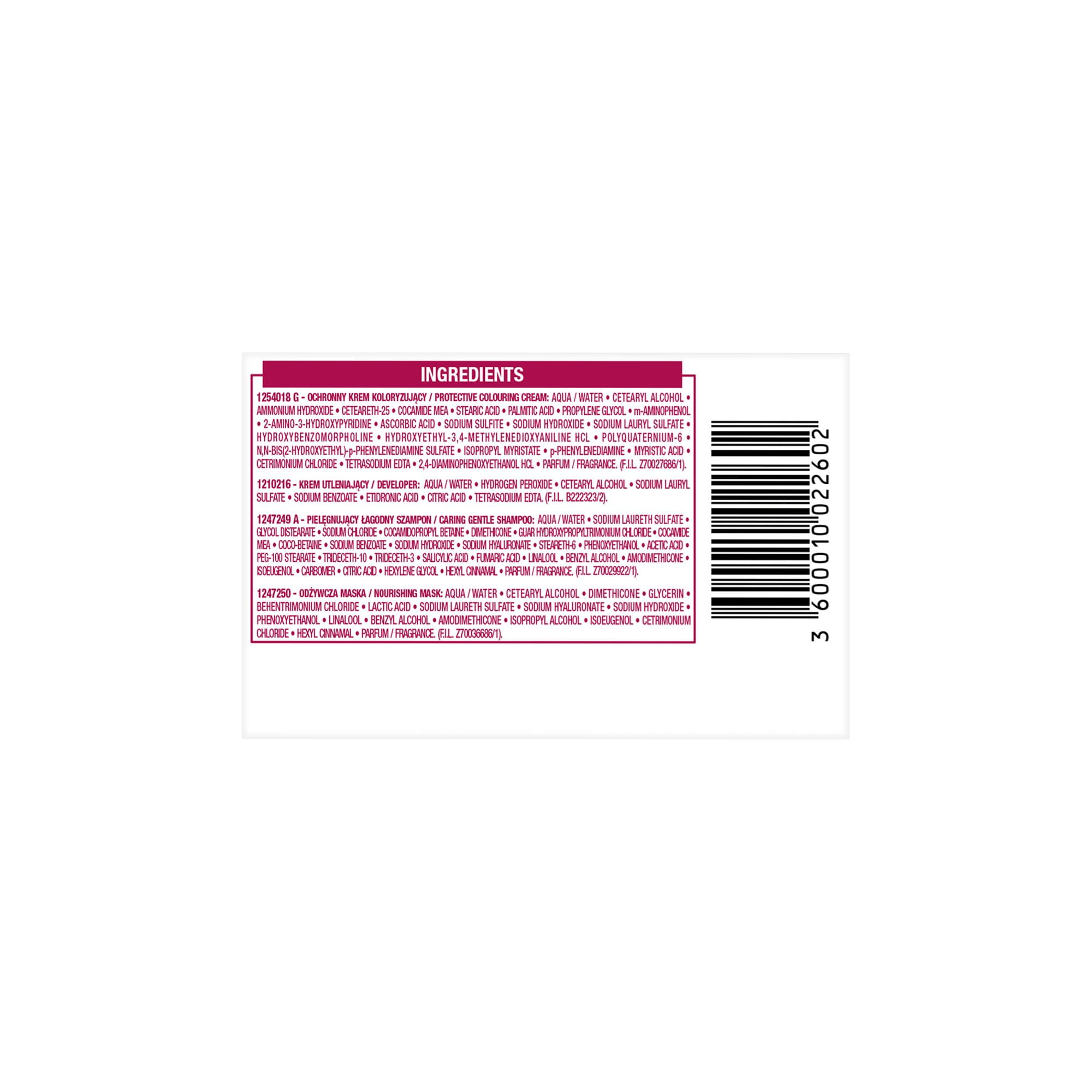 - koloryzacja z potrójną pielęgnacją: ochronny krem koloryzujący, pielęgnujący szampon po koloryzacji, maska odżywcza
