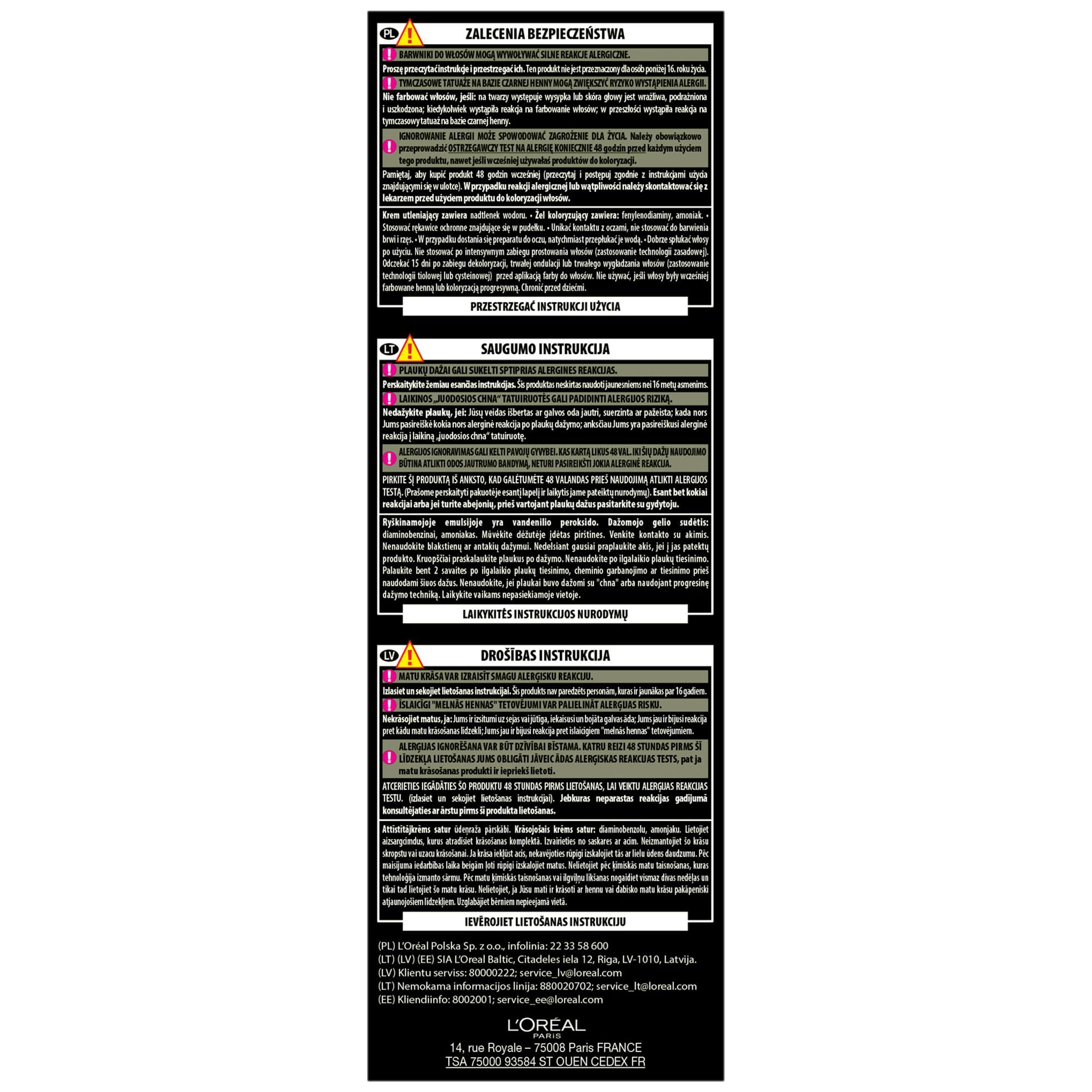 ZALECENIA BEZPIECZEŃSTWA BARWNIKI DO WŁOSÓW MOGĄ WYWOŁYWAĆ SILNE REAKCJE ALERGICZNE. Proszę przeczytać instrukcje i przestrzegać ich. Produkt nie jest przeznaczony dla osób poniżej 16 roku życia. TYMCZASOWE TATUAŻE NA BAZIE CZARNEJ HENNY MOGĄ ZWIĘKSZYĆ RYZYKO WYSTĄPIENIA ALERGII. Nie farbować włosów, jeśli: -na twarzy występuje wysypka lub skóra głowy jest wrażliwa, podrażniona i uszkodzona -kiedykolwiek wystąpiła reakcja na farbowanie włosów -w przeszłości wystąpiła reakcja na tymczasowy tatuaż na bazie czarnej henny. IGNOROWANIE ALERGII MOŻE SPOWODOWAĆ ZAGROŻENIE DLA ŻYCIA. Należy obowiązkowo przeprowadzić OSTRZEGAWCZY TEST NA ALERGIĘ KONIECZNIE 48 godzin przed każdym użyciem tego produktu, nawet jeśli wcześniej używałaś produktów do koloryzacji. Pamiętaj, aby kupić produkt 48 godzin wcześniej. (przeczytaj i postępuj zgodnie z instrukcjami użycia znajdującymi się w ulotce). W przypadku reakcji alergicznej lub wątpliwości należy skontaktować się z lekarzem przed użyciem produktu do koloryzacji włosów. Mleczko (krem) utleniające zawiera nadtlenek wodoru. Krem (żel) koloryzujący zawiera: fenylenodiaminy, fenylenodiaminy (toluenodiaminy), rezorcynę, amoniak. -Stosować rękawice ochronne znajdujące się w pudełku. -Unikać kontaktu z oczami, nie stosować do farbowania rzęs lub brwi. -W przypadku dostania się preparatu do oczu, natychmiast przepłukać je wodą. -Dobrze spłukać włosy po użyciu. Odczekać 15 dni po zabiegu trwałej ondulacji lub trwałego wygładzania włosów (zastosowanie technologii tiolowej lub cysteinowej) przed aplikacją farby do włosów. -Nie używać, jeśli włosy były wcześniej farbowane henną lub koloryzacją progresywną. -Chronić przed dziećmi. PRZESTRZEGAĆ INSTRUKCJI UŻYCIA Należy zapoznać się z listą składników znajdującą się poniżej.