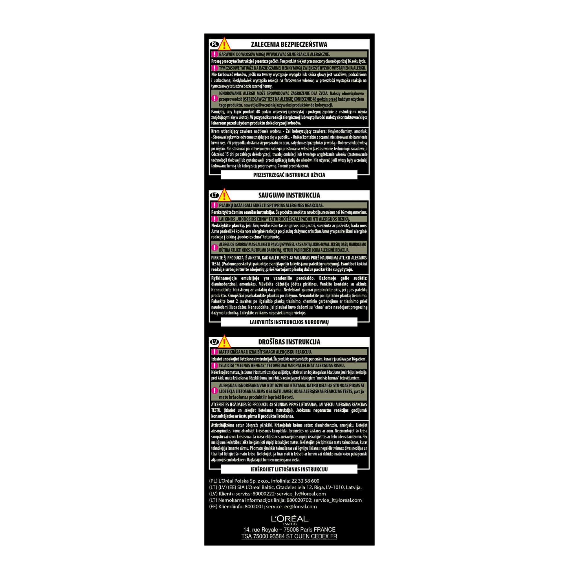 ZALECENIA BEZPIECZEŃSTWA BARWNIKI DO WŁOSÓW MOGĄ WYWOŁYWAĆ SILNE REAKCJE ALERGICZNE. Proszę przeczytać instrukcje i przestrzegać ich. Produkt nie jest przeznaczony dla osób poniżej 16 roku życia. TYMCZASOWE TATUAŻE NA BAZIE CZARNEJ HENNY MOGĄ ZWIĘKSZYĆ RYZYKO WYSTĄPIENIA ALERGII. Nie farbować włosów, jeśli: -na twarzy występuje wysypka lub skóra głowy jest wrażliwa, podrażniona i uszkodzona -kiedykolwiek wystąpiła reakcja na farbowanie włosów -w przeszłości wystąpiła reakcja na tymczasowy tatuaż na bazie czarnej henny. IGNOROWANIE ALERGII MOŻE SPOWODOWAĆ ZAGROŻENIE DLA ŻYCIA. Należy obowiązkowo przeprowadzić OSTRZEGAWCZY TEST NA ALERGIĘ KONIECZNIE 48 godzin przed każdym użyciem tego produktu, nawet jeśli wcześniej używałaś produktów do koloryzacji. Pamiętaj, aby kupić produkt 48 godzin wcześniej. (przeczytaj i postępuj zgodnie z instrukcjami użycia znajdującymi się w ulotce). W przypadku reakcji alergicznej lub wątpliwości należy skontaktować się z lekarzem przed użyciem produktu do koloryzacji włosów. Mleczko (krem) utleniające zawiera nadtlenek wodoru. Krem (żel) koloryzujący zawiera: fenylenodiaminy, fenylenodiaminy (toluenodiaminy), rezorcynę, amoniak. -Stosować rękawice ochronne znajdujące się w pudełku. -Unikać kontaktu z oczami, nie stosować do farbowania rzęs lub brwi. -W przypadku dostania się preparatu do oczu, natychmiast przepłukać je wodą. -Dobrze spłukać włosy po użyciu. Odczekać 15 dni po zabiegu trwałej ondulacji lub trwałego wygładzania włosów (zastosowanie technologii tiolowej lub cysteinowej) przed aplikacją farby do włosów. -Nie używać, jeśli włosy były wcześniej farbowane henną lub koloryzacją progresywną. -Chronić przed dziećmi. PRZESTRZEGAĆ INSTRUKCJI UŻYCIA Należy zapoznać się z listą składników znajdującą się poniżej.