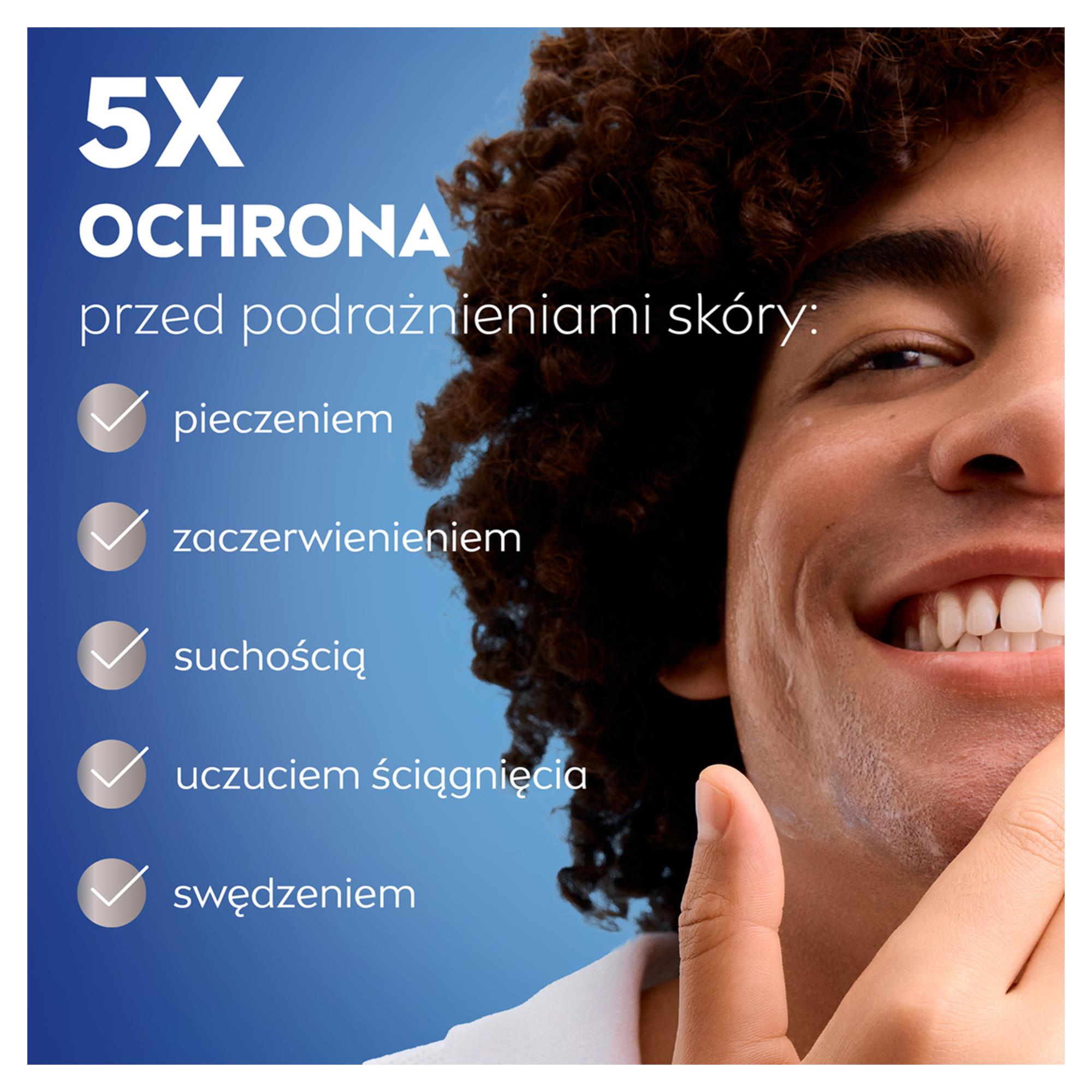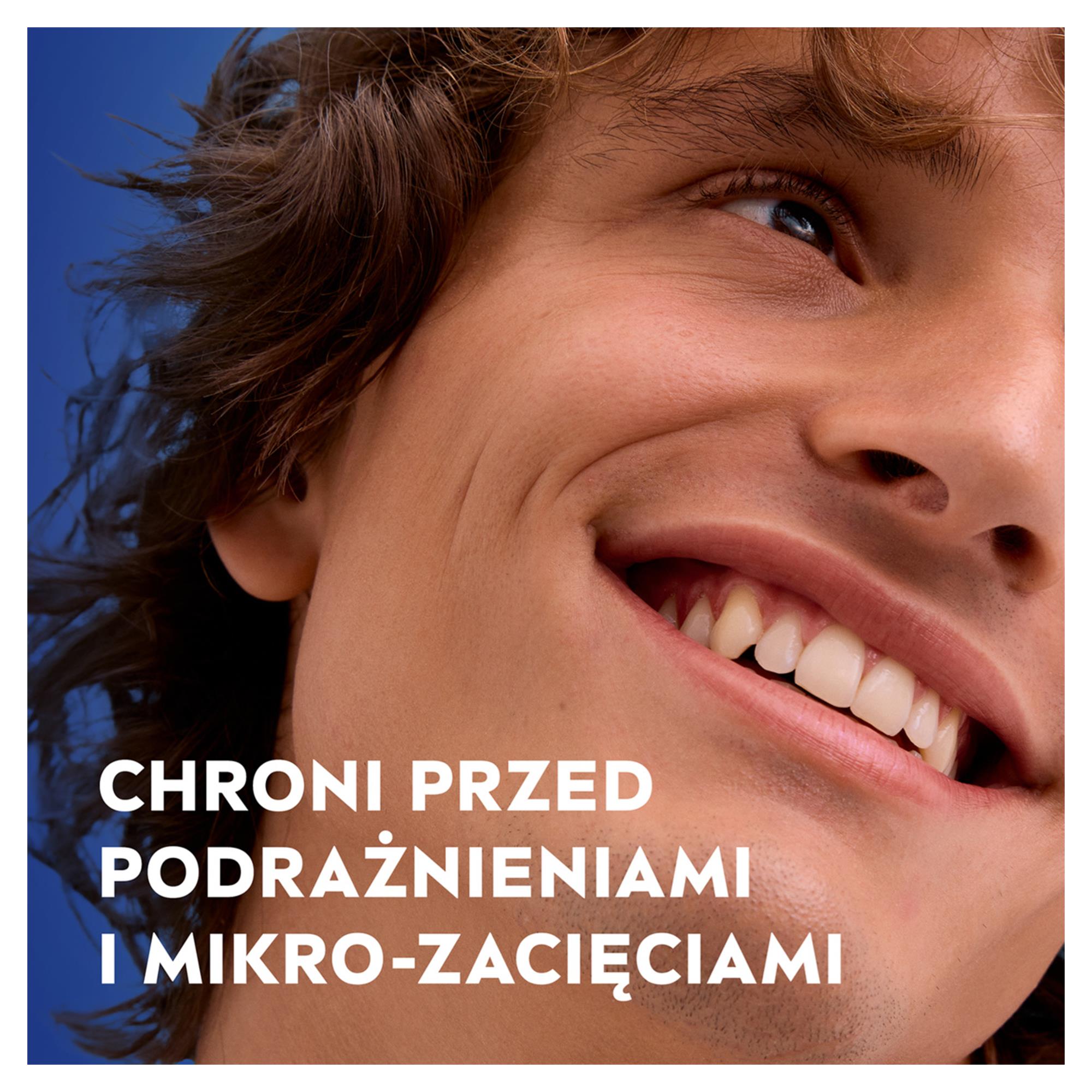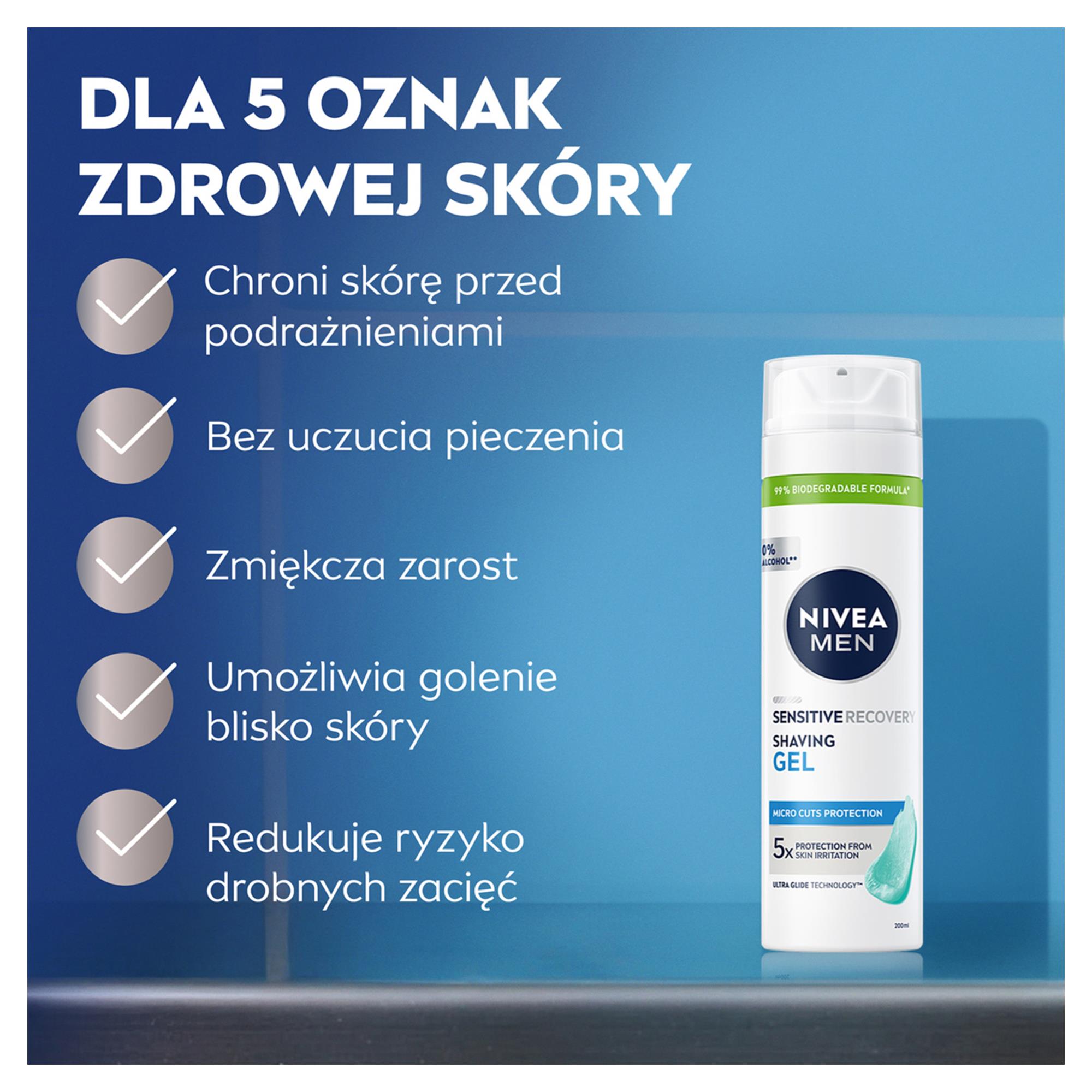 Bezalkoholowy*, regeneracyjny żel chroni skórę przed mikro-zacięciami podczas golenia. Kojąca i pielęgnująca formuła wzbogacona o naturalny rumianek i ekstrakt roślinny chroni skórę przed podrażnieniami bez uczucia pieczenia. Dodatkowo zmiękcza zarost umożliwiając dokładne i komfortowe golenie blisko skóry.*bez zawartości alkoholu etylowego, który podrażnia skórę.Dla najlepszego efektu wypróbuj też pozostałe kosmetyki z linii Sensitive: wodę i balsam po goleniu, żel do mycia ciała oraz kremy do pielęgnacji twarzy.Tolerancja dla skóry potwierdzona dermatologicznie na wrażliwej skórze mężczyzn.NIVEA MEN - Zacznij działać!