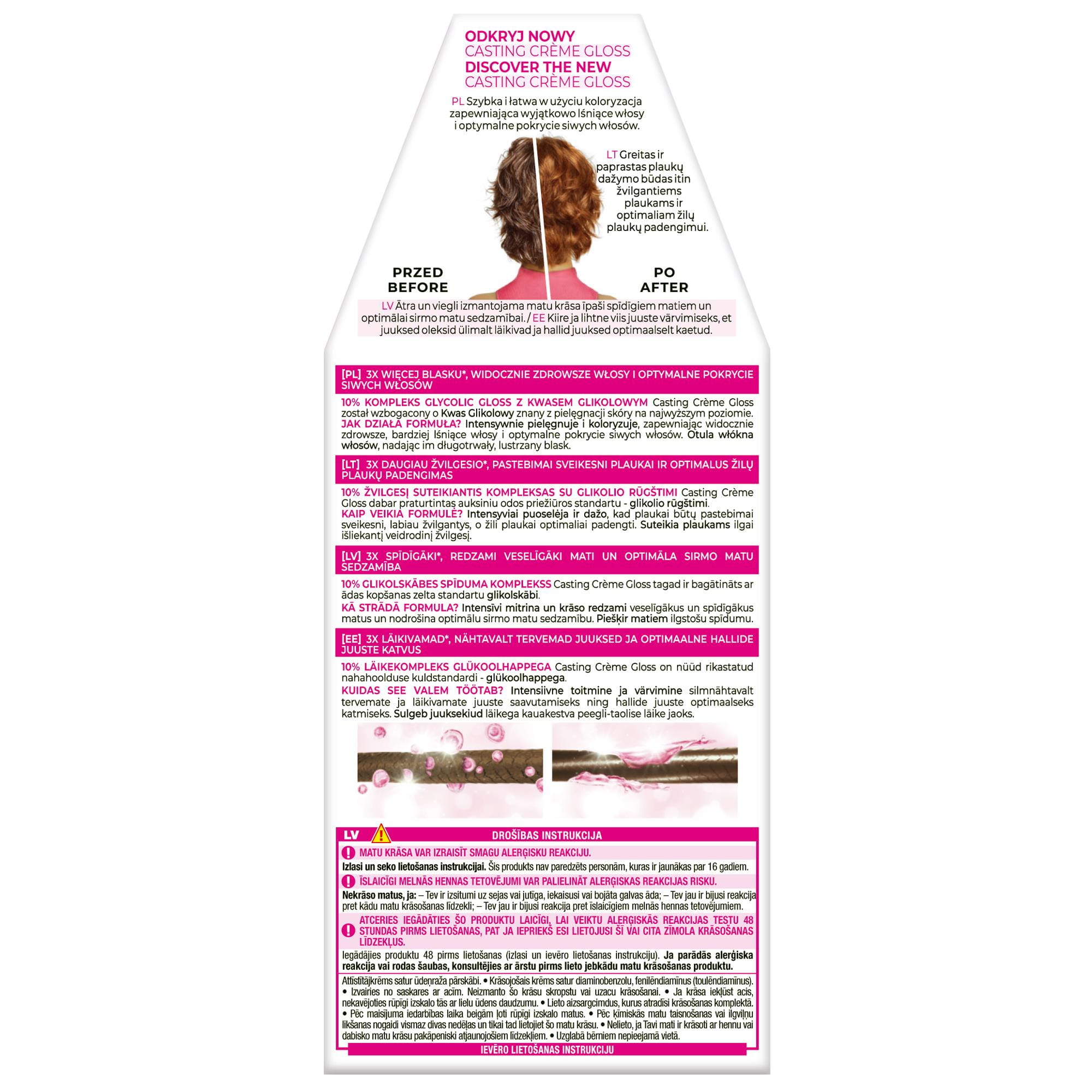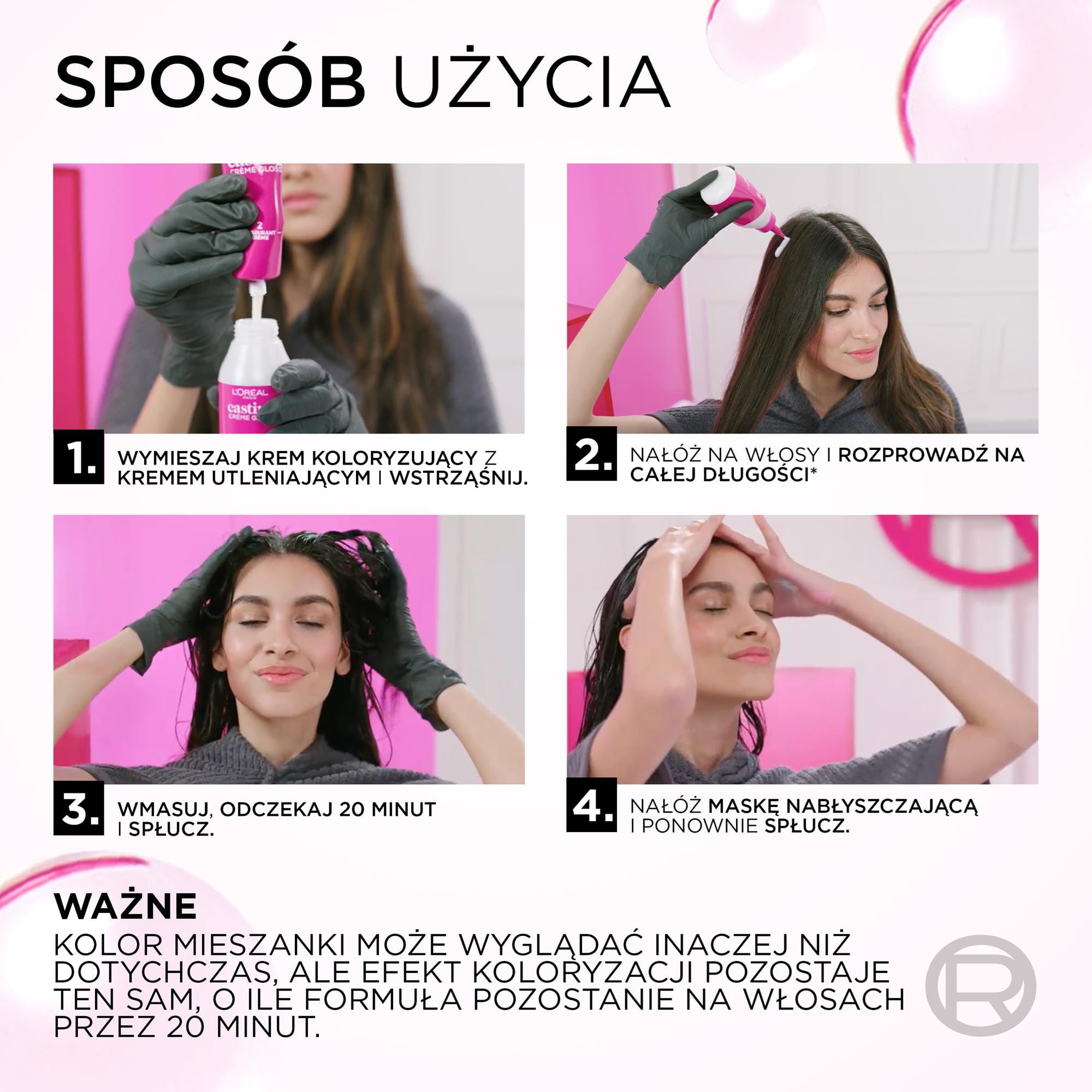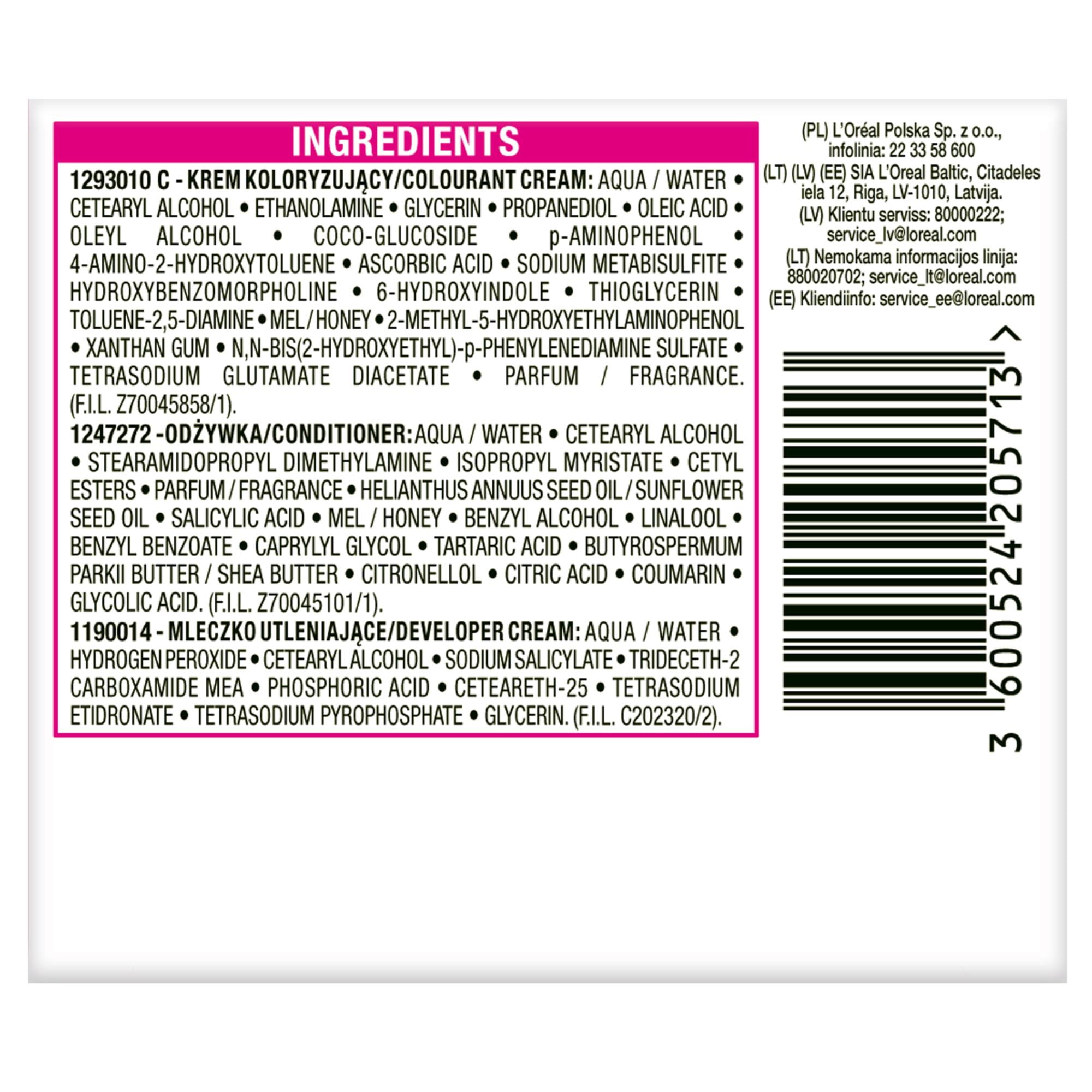 ZALECENIA BEZPIECZEŃSTWA BARWNIKI DO WŁOSÓW MOGĄ WYWOŁYWAĆ SILNE REAKCJE ALERGICZNE. Proszę przeczytać instrukcje i przestrzegać ich. Produkt nie jest przeznaczony dla osób poniżej 16 roku życia. TYMCZASOWE TATUAŻE NA BAZIE CZARNEJ HENNY MOGĄ ZWIĘKSZYĆ RYZYKO WYSTĄPIENIA ALERGII. Nie farbować włosów, jeśli: -na twarzy występuje wysypka lub skóra głowy jest wrażliwa, podrażniona i uszkodzona -kiedykolwiek wystąpiła reakcja na farbowanie włosów -w przeszłości wystąpiła reakcja na tymczasowy tatuaż na bazie czarnej henny. IGNOROWANIE ALERGII MOŻE SPOWODOWAĆ ZAGROŻENIE DLA ŻYCIA. Należy obowiązkowo przeprowadzić OSTRZEGAWCZY TEST NA ALERGIĘ KONIECZNIE 48 godzin przed każdym użyciem tego produktu, nawet jeśli wcześniej używałaś produktów do koloryzacji. Pamiętaj, aby kupić produkt 48 godzin wcześniej. (przeczytaj i postępuj zgodnie z instrukcjami użycia znajdującymi się w ulotce). W przypadku reakcji alergicznej lub wątpliwości należy skontaktować się z lekarzem przed użyciem produktu do koloryzacji włosów. Mleczko (krem) utleniające zawiera nadtlenek wodoru. Krem (żel) koloryzujący zawiera: fenylenodiaminy, fenylenodiaminy (toluenodiaminy), rezorcynę, amoniak. -Stosować rękawice ochronne znajdujące się w pudełku. -Unikać kontaktu z oczami, nie stosować do farbowania rzęs lub brwi. -W przypadku dostania się preparatu do oczu, natychmiast przepłukać je wodą. -Dobrze spłukać włosy po użyciu. Odczekać 15 dni po zabiegu trwałej ondulacji lub trwałego wygładzania włosów (zastosowanie technologii tiolowej lub cysteinowej) przed aplikacją farby do włosów. -Nie używać, jeśli włosy były wcześniej farbowane henną lub koloryzacją progresywną. -Chronić przed dziećmi. PRZESTRZEGAĆ INSTRUKCJI UŻYCIA Należy zapoznać się z listą składników znajdującą się poniżej.