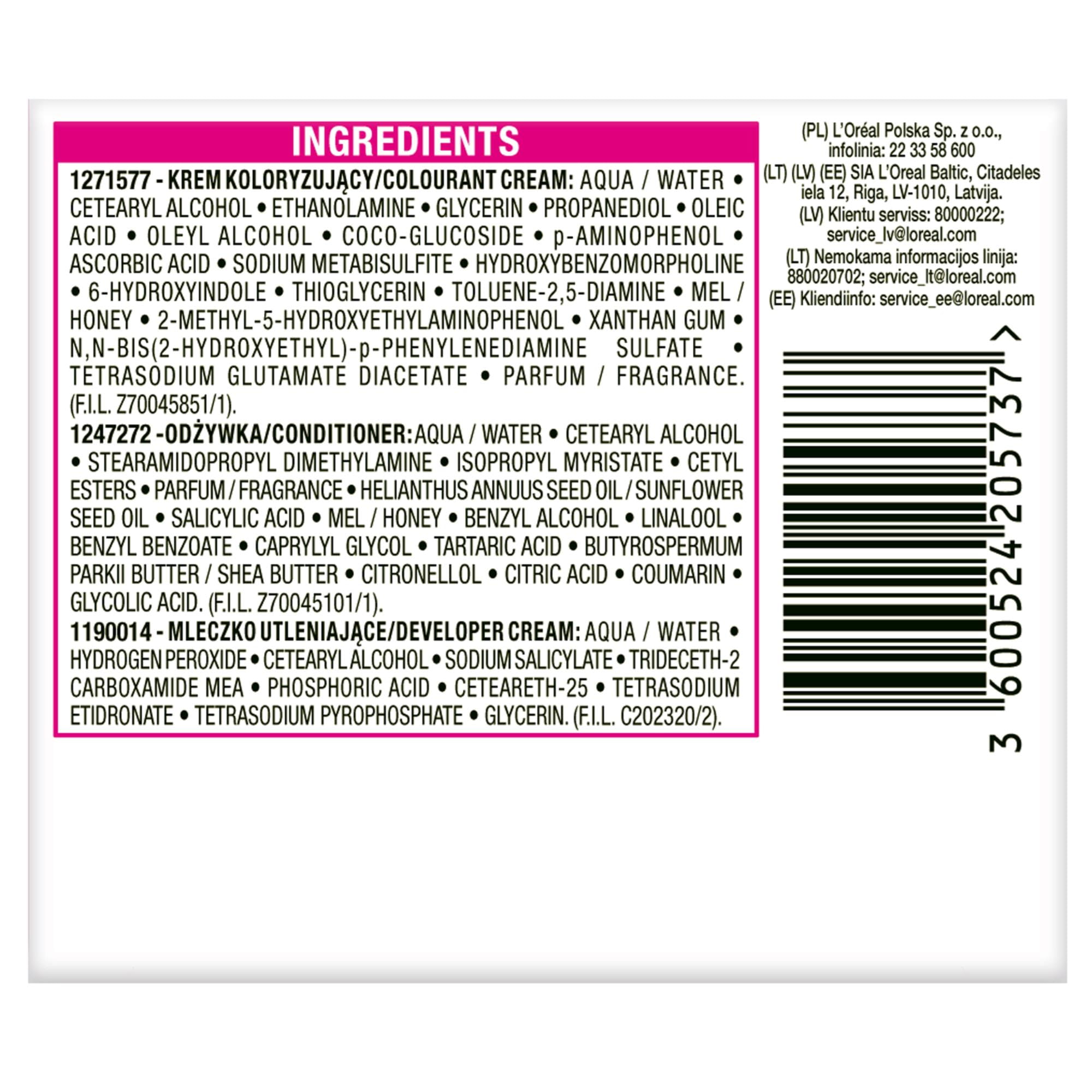 ZALECENIA BEZPIECZEŃSTWA BARWNIKI DO WŁOSÓW MOGĄ WYWOŁYWAĆ SILNE REAKCJE ALERGICZNE. Proszę przeczytać instrukcje i przestrzegać ich. Produkt nie jest przeznaczony dla osób poniżej 16 roku życia. TYMCZASOWE TATUAŻE NA BAZIE CZARNEJ HENNY MOGĄ ZWIĘKSZYĆ RYZYKO WYSTĄPIENIA ALERGII. Nie farbować włosów, jeśli: -na twarzy występuje wysypka lub skóra głowy jest wrażliwa, podrażniona i uszkodzona -kiedykolwiek wystąpiła reakcja na farbowanie włosów -w przeszłości wystąpiła reakcja na tymczasowy tatuaż na bazie czarnej henny. IGNOROWANIE ALERGII MOŻE SPOWODOWAĆ ZAGROŻENIE DLA ŻYCIA. Należy obowiązkowo przeprowadzić OSTRZEGAWCZY TEST NA ALERGIĘ KONIECZNIE 48 godzin przed każdym użyciem tego produktu, nawet jeśli wcześniej używałaś produktów do koloryzacji. Pamiętaj, aby kupić produkt 48 godzin wcześniej. (przeczytaj i postępuj zgodnie z instrukcjami użycia znajdującymi się w ulotce). W przypadku reakcji alergicznej lub wątpliwości należy skontaktować się z lekarzem przed użyciem produktu do koloryzacji włosów. Mleczko (krem) utleniające zawiera nadtlenek wodoru. Krem (żel) koloryzujący zawiera: fenylenodiaminy, fenylenodiaminy (toluenodiaminy), rezorcynę, amoniak. -Stosować rękawice ochronne znajdujące się w pudełku. -Unikać kontaktu z oczami, nie stosować do farbowania rzęs lub brwi. -W przypadku dostania się preparatu do oczu, natychmiast przepłukać je wodą. -Dobrze spłukać włosy po użyciu. Odczekać 15 dni po zabiegu trwałej ondulacji lub trwałego wygładzania włosów (zastosowanie technologii tiolowej lub cysteinowej) przed aplikacją farby do włosów. -Nie używać, jeśli włosy były wcześniej farbowane henną lub koloryzacją progresywną. -Chronić przed dziećmi. PRZESTRZEGAĆ INSTRUKCJI UŻYCIA Należy zapoznać się z listą składników znajdującą się poniżej.