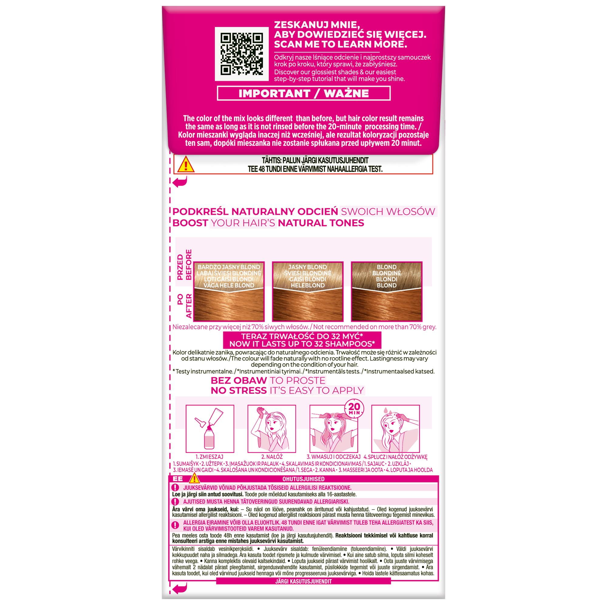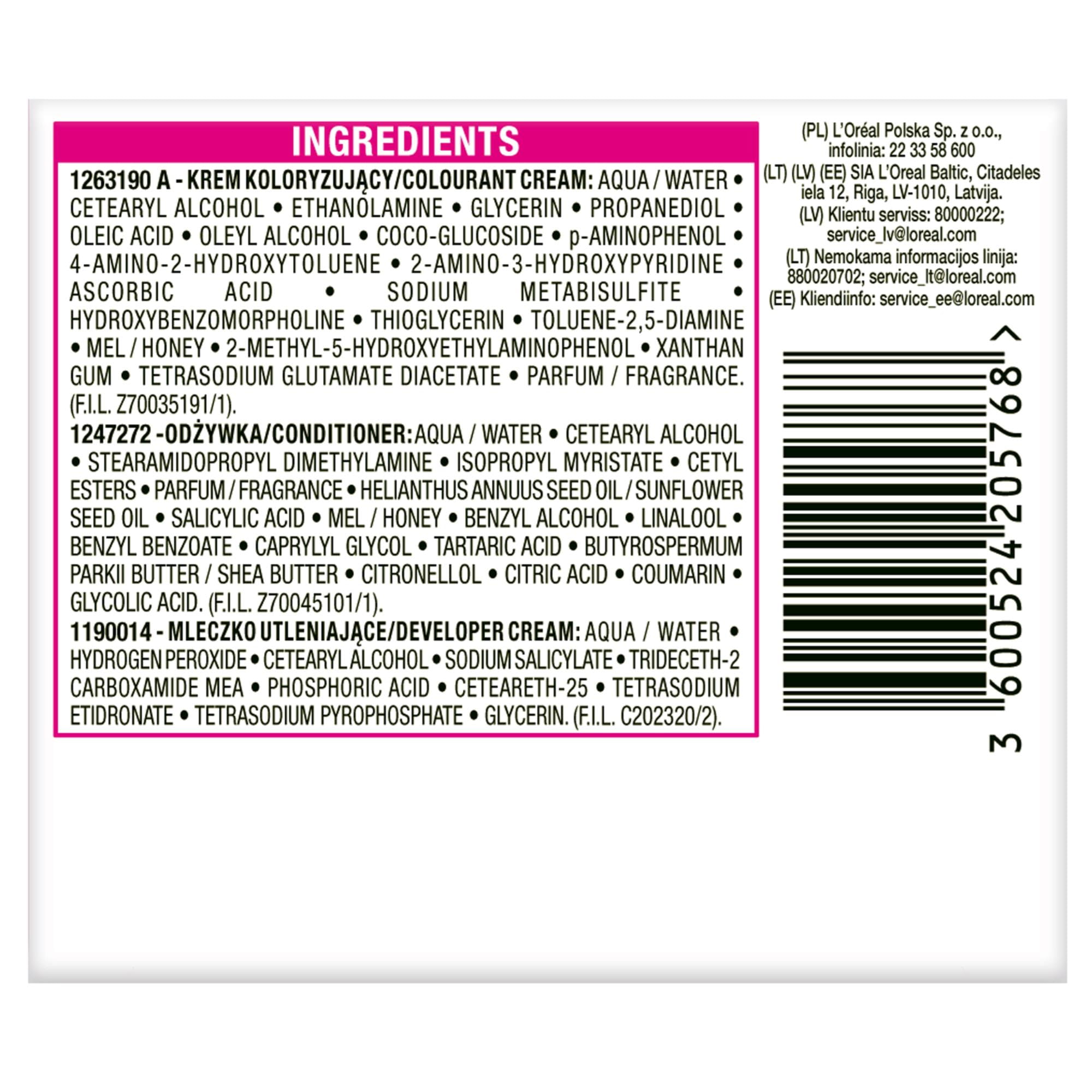 ZALECENIA BEZPIECZEŃSTWA BARWNIKI DO WŁOSÓW MOGĄ WYWOŁYWAĆ SILNE REAKCJE ALERGICZNE. Proszę przeczytać instrukcje i przestrzegać ich. Produkt nie jest przeznaczony dla osób poniżej 16 roku życia. TYMCZASOWE TATUAŻE NA BAZIE CZARNEJ HENNY MOGĄ ZWIĘKSZYĆ RYZYKO WYSTĄPIENIA ALERGII. Nie farbować włosów, jeśli: -na twarzy występuje wysypka lub skóra głowy jest wrażliwa, podrażniona i uszkodzona -kiedykolwiek wystąpiła reakcja na farbowanie włosów -w przeszłości wystąpiła reakcja na tymczasowy tatuaż na bazie czarnej henny. IGNOROWANIE ALERGII MOŻE SPOWODOWAĆ ZAGROŻENIE DLA ŻYCIA. Należy obowiązkowo przeprowadzić OSTRZEGAWCZY TEST NA ALERGIĘ KONIECZNIE 48 godzin przed każdym użyciem tego produktu, nawet jeśli wcześniej używałaś produktów do koloryzacji. Pamiętaj, aby kupić produkt 48 godzin wcześniej. (przeczytaj i postępuj zgodnie z instrukcjami użycia znajdującymi się w ulotce). W przypadku reakcji alergicznej lub wątpliwości należy skontaktować się z lekarzem przed użyciem produktu do koloryzacji włosów. Mleczko (krem) utleniające zawiera nadtlenek wodoru. Krem (żel) koloryzujący zawiera: fenylenodiaminy, fenylenodiaminy (toluenodiaminy), rezorcynę, amoniak. -Stosować rękawice ochronne znajdujące się w pudełku. -Unikać kontaktu z oczami, nie stosować do farbowania rzęs lub brwi. -W przypadku dostania się preparatu do oczu, natychmiast przepłukać je wodą. -Dobrze spłukać włosy po użyciu. Odczekać 15 dni po zabiegu trwałej ondulacji lub trwałego wygładzania włosów (zastosowanie technologii tiolowej lub cysteinowej) przed aplikacją farby do włosów. -Nie używać, jeśli włosy były wcześniej farbowane henną lub koloryzacją progresywną. -Chronić przed dziećmi. PRZESTRZEGAĆ INSTRUKCJI UŻYCIA Należy zapoznać się z listą składników znajdującą się poniżej.