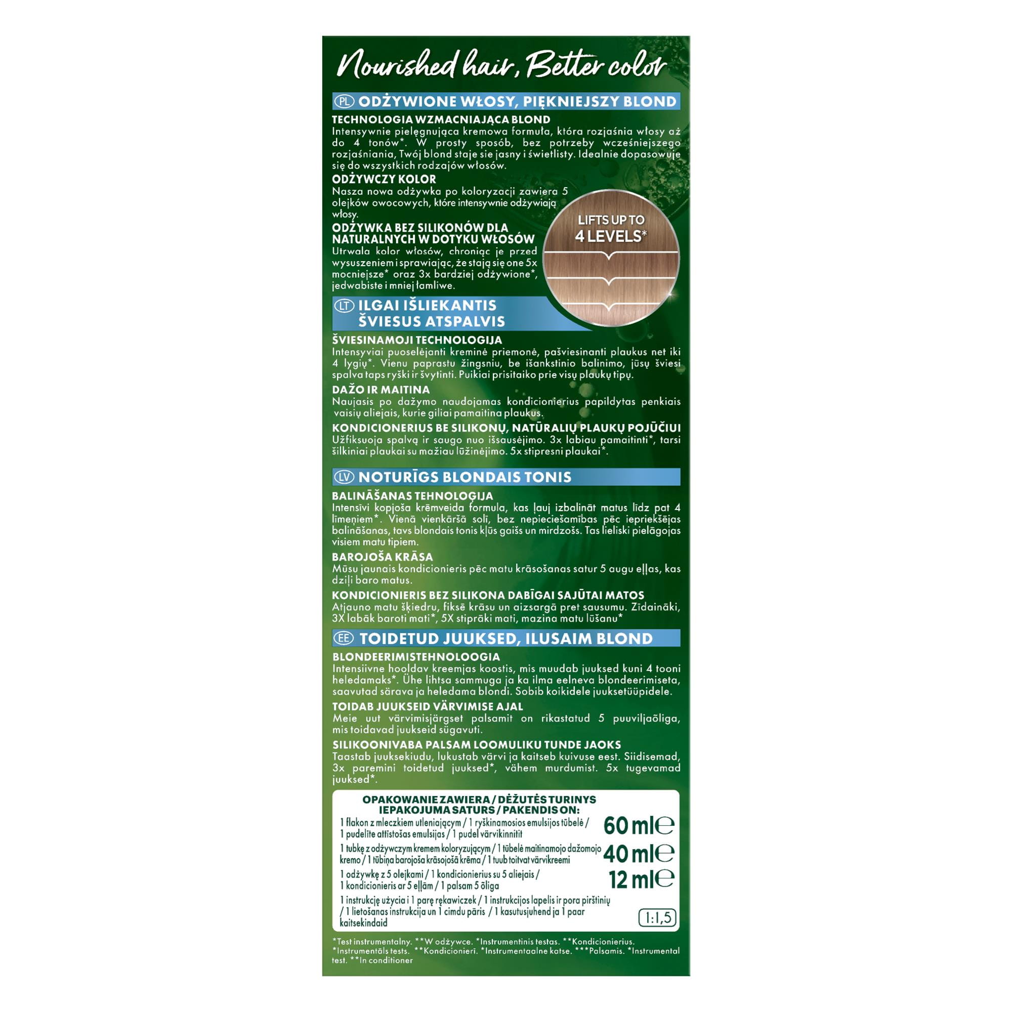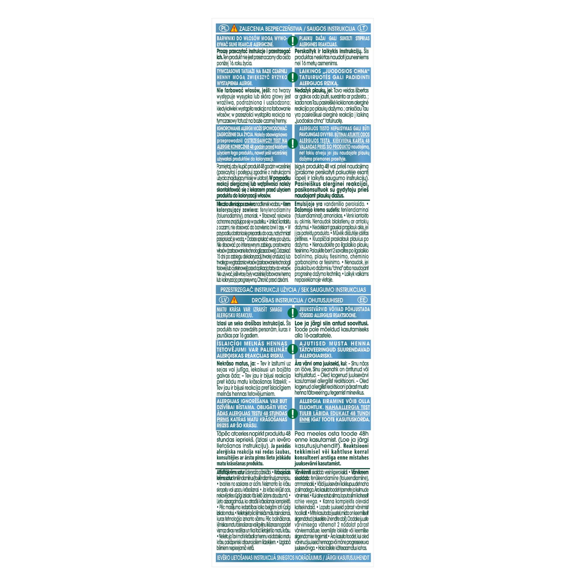 ZALECENIA BEZPIECZEŃSTWA BARWNIKI DO WŁOSÓW MOGĄ WYWOŁYWAĆ SILNE REAKCJE ALERGICZNE. Proszę przeczytać instrukcje i przestrzegać ich. Produkt nie jest przeznaczony dla osób poniżej 16 roku życia. TYMCZASOWE TATUAŻE NA BAZIE CZARNEJ HENNY MOGĄ ZWIĘKSZYĆ RYZYKO WYSTĄPIENIA ALERGII. Nie farbować włosów, jeśli: -na twarzy występuje wysypka lub skóra głowy jest wrażliwa, podrażniona i uszkodzona -kiedykolwiek wystąpiła reakcja na farbowanie włosów -w przeszłości wystąpiła reakcja na tymczasowy tatuaż na bazie czarnej henny. IGNOROWANIE ALERGII MOŻE SPOWODOWAĆ ZAGROŻENIE DLA ŻYCIA. Należy obowiązkowo przeprowadzić OSTRZEGAWCZY TEST NA ALERGIĘ KONIECZNIE 48 godzin przed każdym użyciem tego produktu, nawet jeśli wcześniej używałaś produktów do koloryzacji. Pamiętaj, aby kupić produkt 48 godzin wcześniej. (przeczytaj i postępuj zgodnie z instrukcjami użycia znajdującymi się w ulotce). W przypadku reakcji alergicznej lub wątpliwości należy skontaktować się z lekarzem przed użyciem produktu do koloryzacji włosów. Mleczko (krem) utleniające zawiera nadtlenek wodoru. Krem (żel) koloryzujący zawiera: fenylenodiaminy, fenylenodiaminy (toluenodiaminy), rezorcynę, amoniak. -Stosować rękawice ochronne znajdujące się w pudełku. -Unikać kontaktu z oczami, nie stosować do farbowania rzęs lub brwi. -W przypadku dostania się preparatu do oczu, natychmiast przepłukać je wodą. -Dobrze spłukać włosy po użyciu. Odczekać 15 dni po zabiegu trwałej ondulacji lub trwałego wygładzania włosów (zastosowanie technologii tiolowej lub cysteinowej) przed aplikacją farby do włosów. -Nie używać, jeśli włosy były wcześniej farbowane henną lub koloryzacją progresywną. -Chronić przed dziećmi. PRZESTRZEGAĆ INSTRUKCJI UŻYCIA Należy zapoznać się z listą składników znajdującą się poniżej.