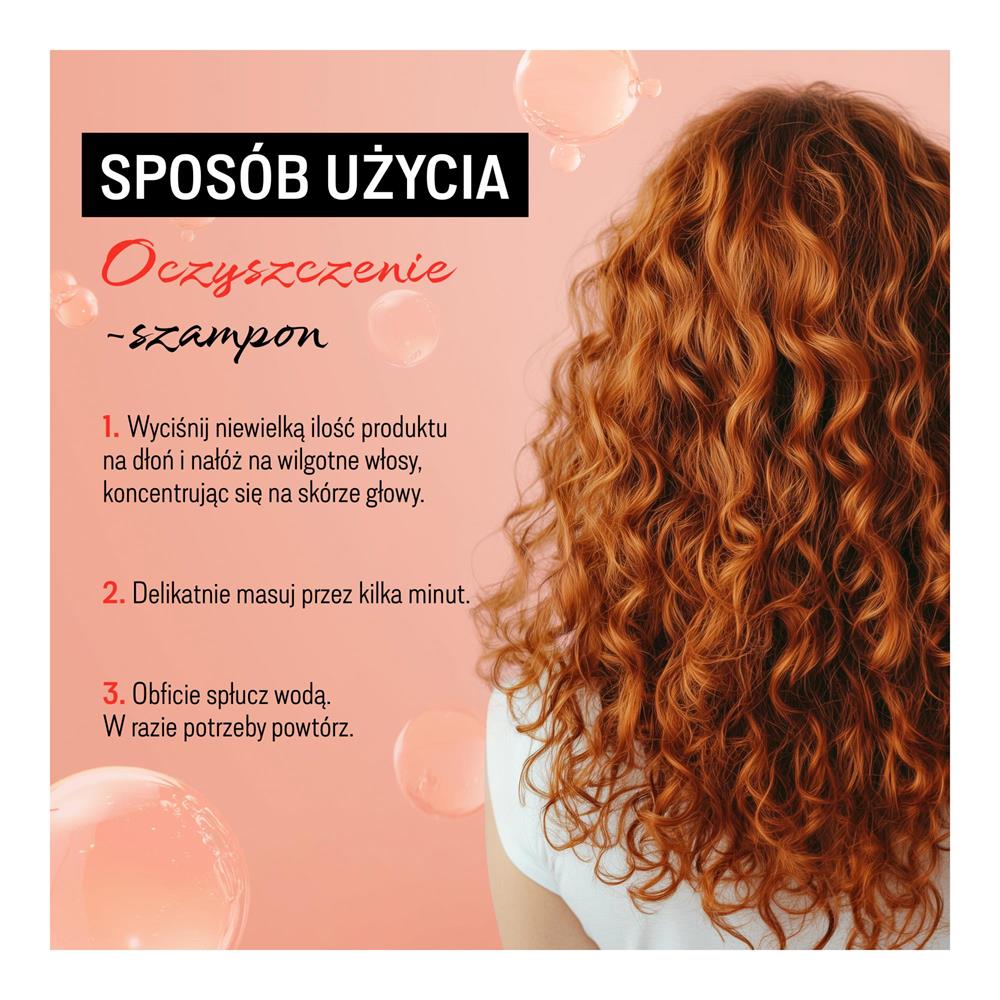 Niewielką ilość szamponu rozprowadź na wilgotnych włosach, delikatnie wmasuj do uzyskania piany, następnie spłucz obficie wodą. W razie potrzeby powtórz czynność.