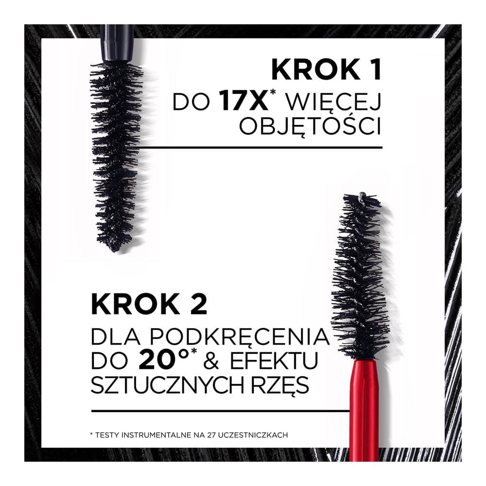 KROK 1: Objętość. Pokryj równomiernie rzęsy pogrubiającym tuszem dla efektu objętości.