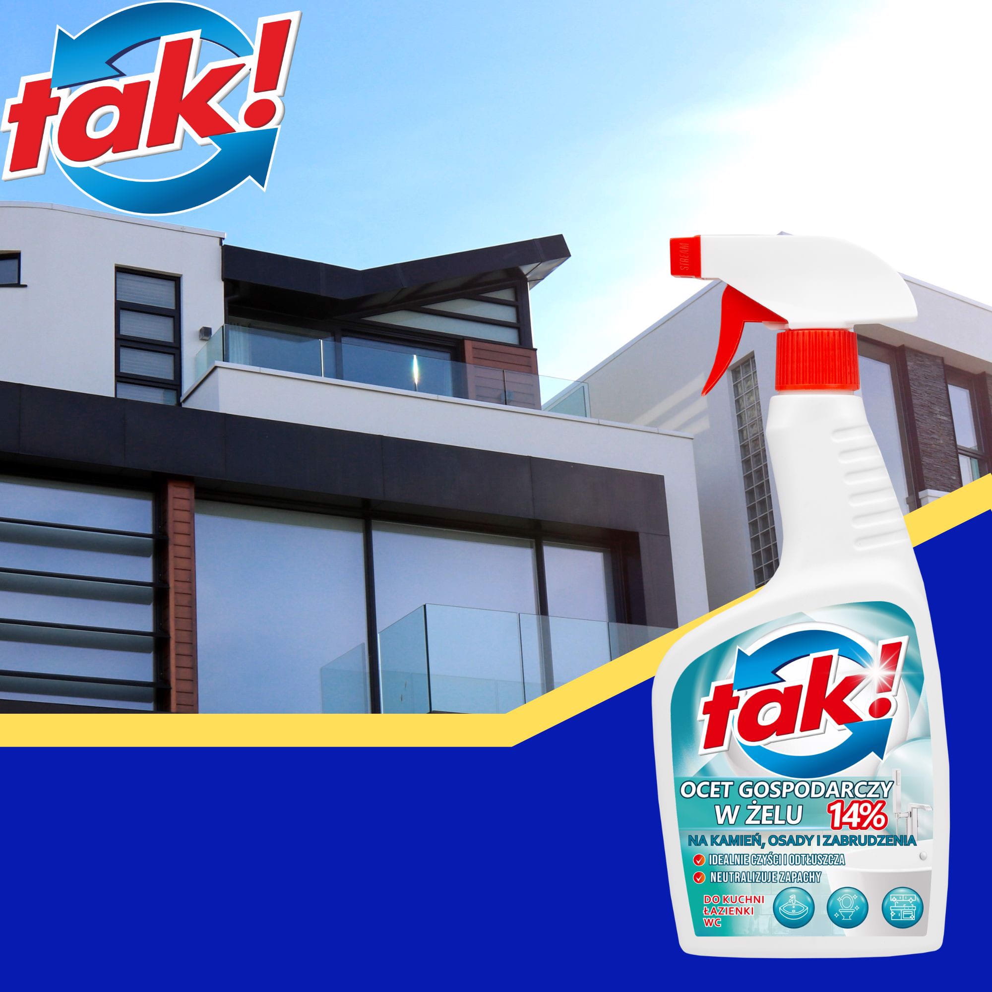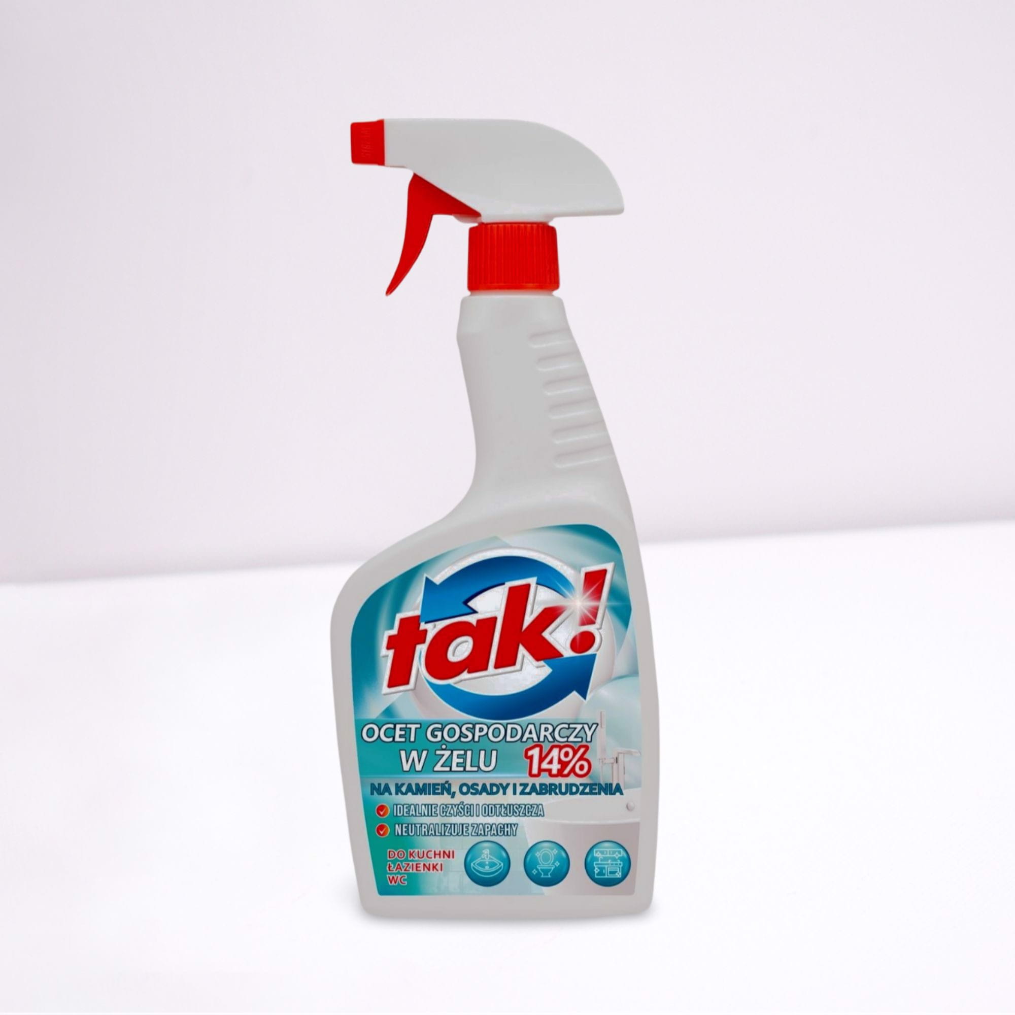 TAK Ocet gospodarczy w żelu to skuteczny środek czyszczący przeznaczony do usuwania kamienia, osadów z mydła oraz codziennych zabrudzeń w gospodarstwie domowym. Dzięki żelowej formule produkt dłużej utrzymuje się na czyszczonej powierzchni, co zwiększa jego skuteczność działania i pozwala na dokładniejsze usuwanie trudnych osadów.